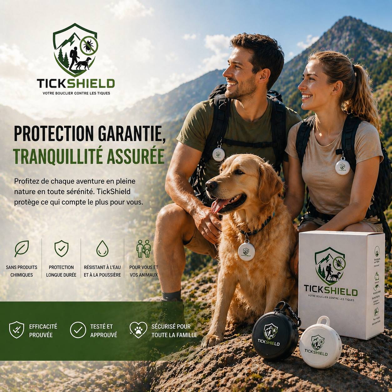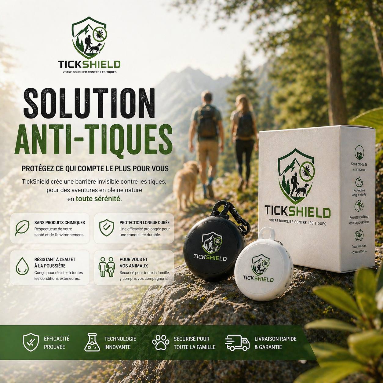 Protégez-vous efficacement contre les tiques, sans produits chimiques. TickShield crée une barrière invisible pour vous et vos animaux, même en pleine nature.